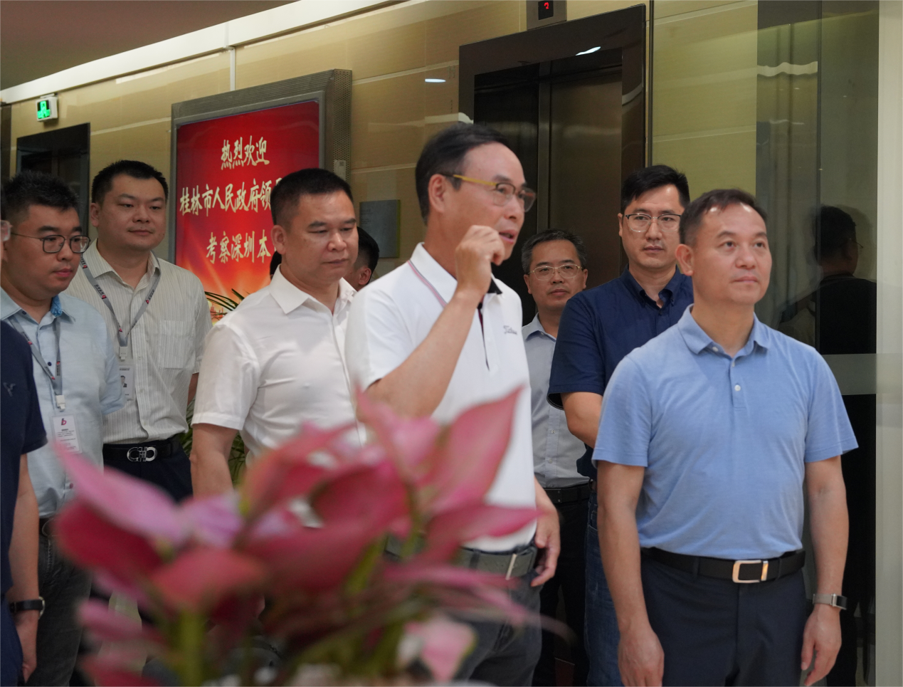深圳本貿(mào)董事長謝鄂強(前排左一)向桂林市人民政府副市長王昕(前排右一)介紹公司情況。